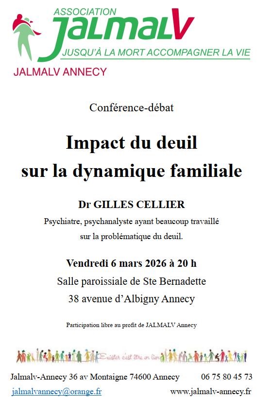 - Une conférence « L’impact du deuil sur la dynamique familiale », le vendredi 6 mars à 20h à Annecy (affiche ci-dessous)