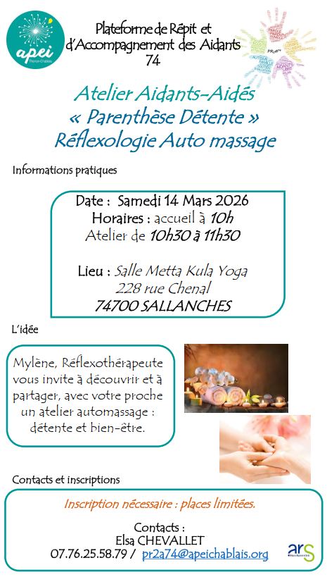 - Ateliers à destination des Aidants et des Aidés : Samedi 14 Mars de 10h à 11h30, Atelier Réflexologie Auto massage « Parenthèse Détente » à Sallanches.