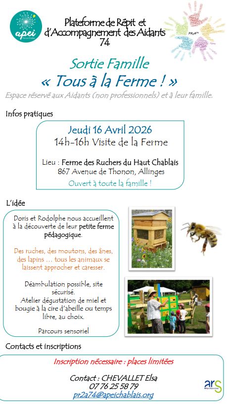 - Sortie Famille : jeudi 16 Avril de 14h à 16h, Sortie « Tous à la ferme ! » Visite à la Ferme du Haut-Chablais à Allinges.