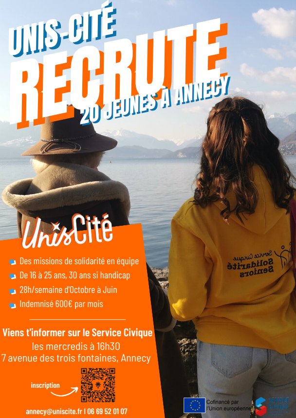 Unis-Cité recrute 20 volontaires en Service Civique sur Annecy : des jeunes mobilisés dans la diversité des profils, des âges, des parcours de vie, et uniquement sur leurs motivations.