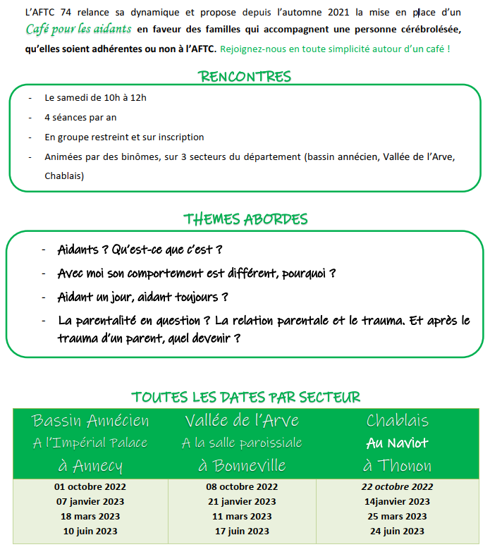 L’Association de Familles de Traumatisés Crâniens et Cérébro-Lésés (AFTC) organise des Café pour les aidants, en faveur des familles qui accompagnent une personne cérébrolésée, qu’elles soient adhérentes ou non à l’AFTC.