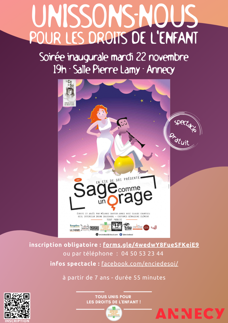 Tous unis pour les droits de l’enfant : afin de célébrer l’ouverture de la manifestation départementale « tous unis pour les droits de l’enfant 2022 » la FOL 74, en partenariat avec la ville d’Annecy, a le plaisir de vous inviter au spectacle créé en 2022 « Sage comme un orage » le mardi 22 novembre à 19h, salle Pierre Lamy à Annecy. L’entrée est gratuite sur inscription via ce formulaire : INSCRIPTION SPECTACLE