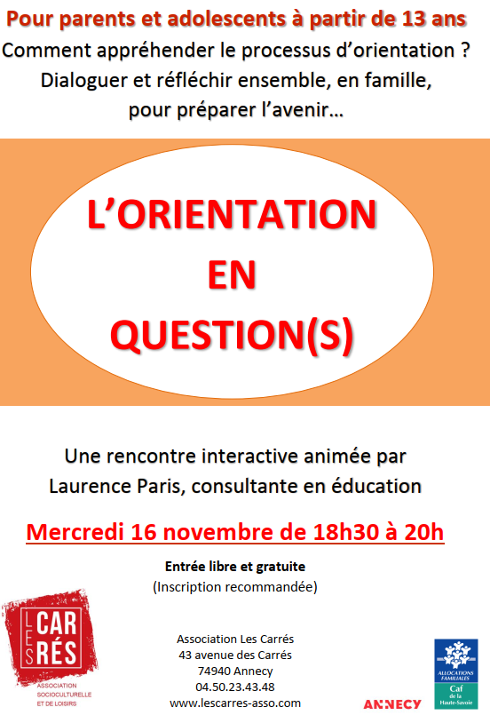 Rencontre interactive « L’orientation en question(s) » : comment appréhender le processus d’orientation ? Dialoguer et réfléchir ensemble, en famille, pour préparer l’avenir… Une rencontre interactive animée par Laurence Paris, consultante en éducation.