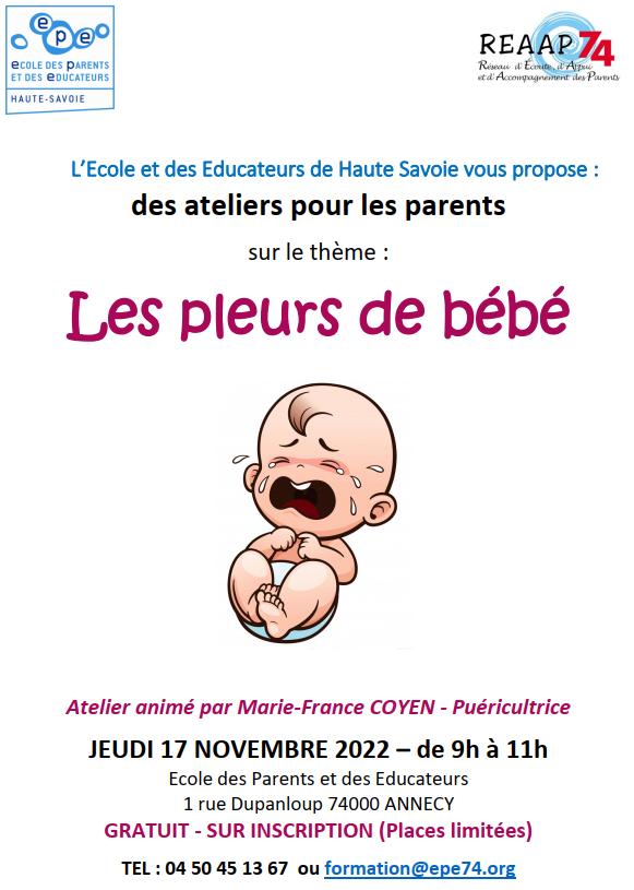 Atelier « Les pleurs de bébé » : peudi 17 novembre de 9h à 11h à l’Ecole des Parents et des Educateurs (Salle Denviolet) – 5 rue Louis ARMAND – 74000 ANNECY.