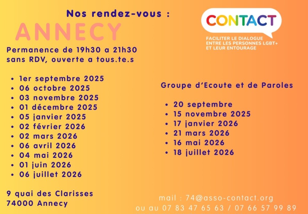 L’association Contact 74, qui œuvre pour faciliter le dialogue entre les personnes LGBTQIA+ et leur entourage, vous propose des permanence, de 19h30 à 21h30 :