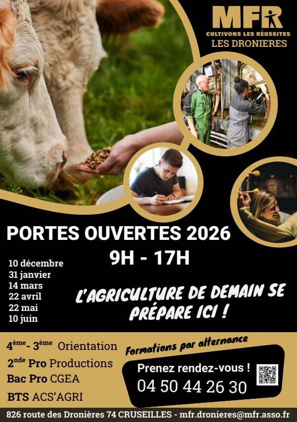 La MFR Le Belvédère et la MFR le Clos de Baz à Sallanches, la MFR les Dronières, la MFR le Villaret et la MFR les 5 chemins, organisent une journée porte ouverte, sur rendez-vous, le samedi 31 janvier, de 9h à 17h.