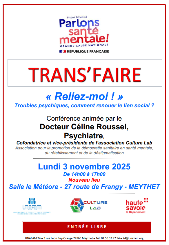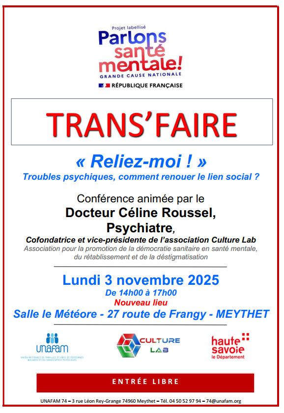 Le lundi 3 novembre : conférence d’information du docteur Céline Roussel, psychiatre, sur le thème : « Reliez-moi ! Troubles psychiques : Comment renouer le lien social », à Meythet, salle du météore, de 14h à 17h. Entrée libre.