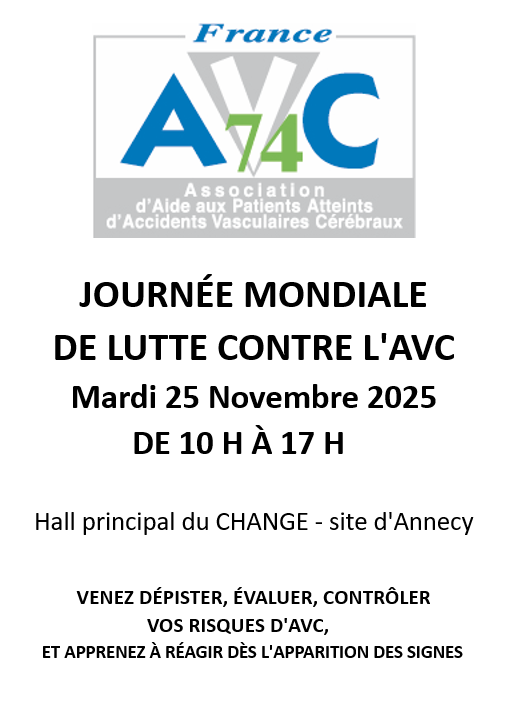 L’association France AVC organise le 25 novembre une journée à l’hôpital d’Annecy (journée mondiale de l’AVC). Les personnes intéressées pourront non seulement s’informer sur l’AVC (signes, le 15, les facteurs de risque…), mais pourront aussi se faire dépister en ce qui concerne les facteurs de risque cardio-vasculaires.