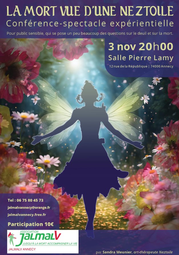 L’association JALMALV (Jusqu’à La Mort Accompagner La Vie) vous propose une conférence-spectacle « LA MORT VUE D’UNE ETOILE » avec Sandra MEUNIER, Art-thérapeute, le lundi 3 novembre à 20h.