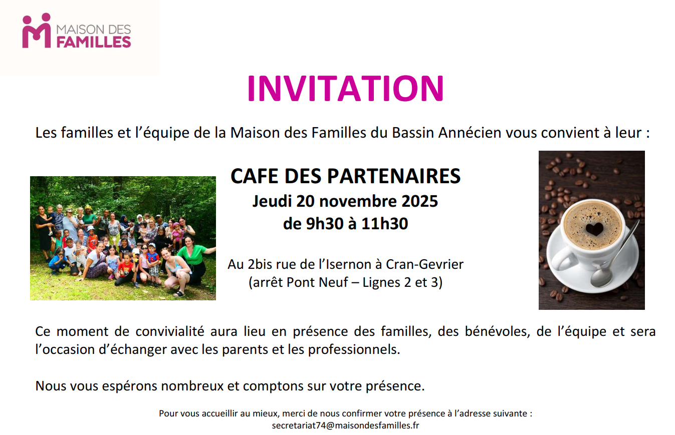 La Maison des Familles organise un « Café des partenaires » le jeudi 20 novembre, de 9h30 à 11h30, en présence des familles, des bénévoles, de l’équipe et sera l’occasion d’échanger avec les parents et les professionnels