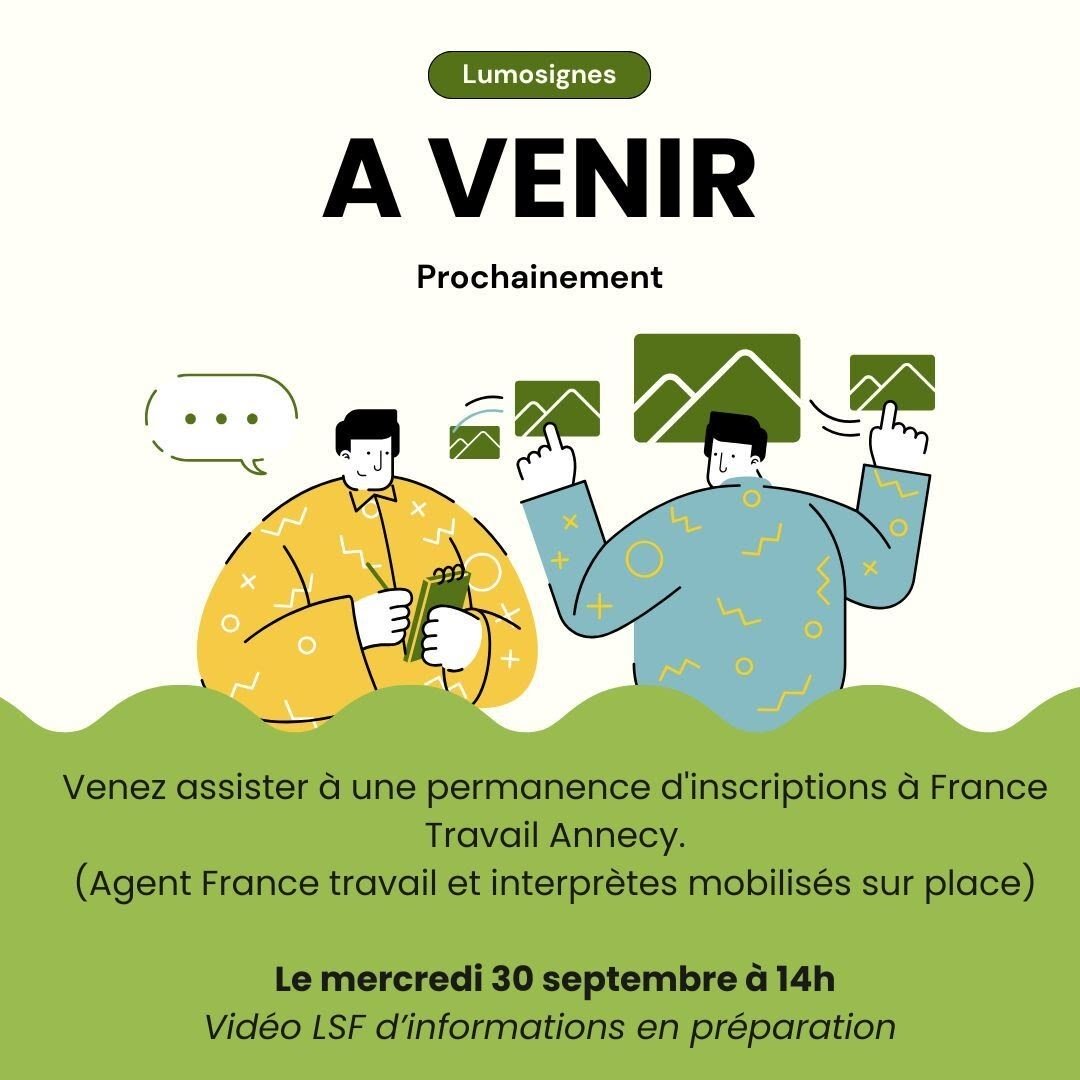 L’association LumoSignes et l’ASGA (Association des Sourds du Grand Annecy) organisent une permanence à destination des personnes sourdes et malentendantes en partenariat avec France Travail. Ce sera l’occasion pour les personnes d’avoir accès à des interprètes en Langue des Signes et d’être en relation directe avec des conseillers Cap Emploi pour faire le point sur leur indemnisation voire de s’inscrire si besoin : le mercredi 30 septembre à 14h.