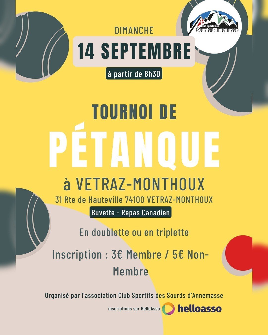 Tournois de pétanque à Vétraz-Monthoux, le 14 septembre, organisé par l’association Club Sportif des Sourds d’Annemasse (voir affiche ci-dessous).